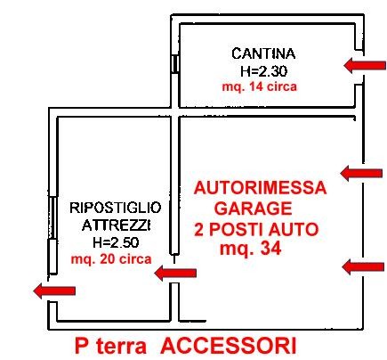 Oltre al fabbricato principale ad uso residenziale, la proprietà include anche un accessorio ad uso GARAGE con due posti auto di mq. 34 e due vani ad uso cantina facilmente accessibili dall'esterno.