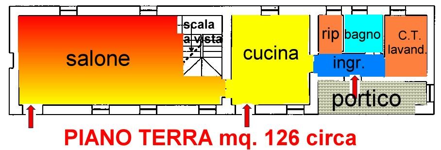 IL PIANO TERRA ha una superficie di mq. 126 e dispone di tre ingressi indipendenti, è composto da: cucina, ampio salone con caminetto, bagno, lavanderia/C.T. e portico;